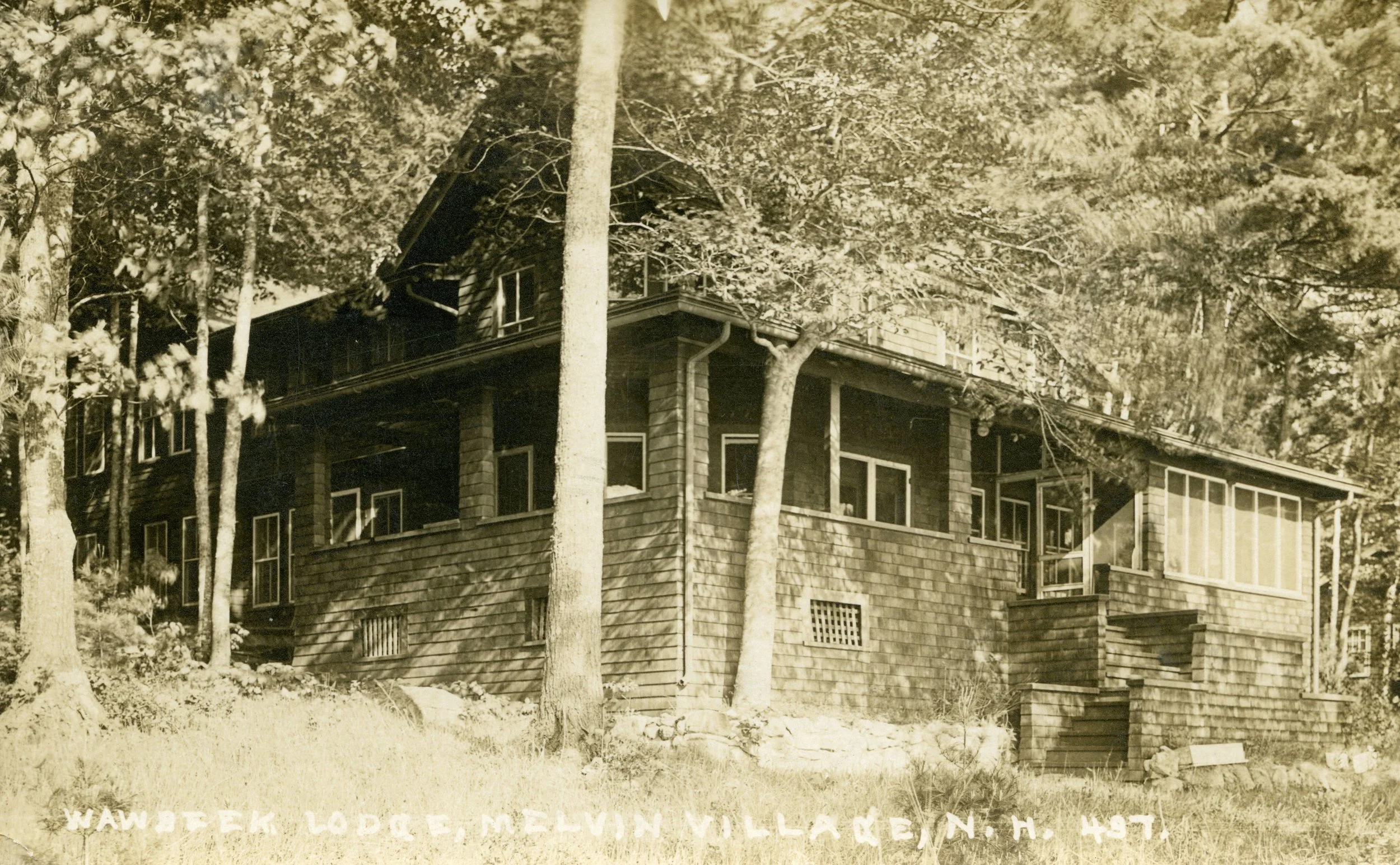 The historic Wawbeek Resort and Shore has witnessed numerous evolutions since it was established by orchestra conductor Henri G. Blaisdell in 1895 as a musicians’ retreat. Until the early 1960s, the Fernald family operated an American Plan summer hotel (including a dining room that accommodated 100 guests), sleeping cottages, a recreation hall fronting a natural beach, and a large dock with a 20 foot high diving tower. The Lake Winnipesaukee mailboat delivered mail to the main dock into the 1970s, and Wawbeek Shore cottagers would make a daily walk along north and south lakeside shore paths to fetch their mail from boxes at the hotel. The dock and its diminutive two-room dock house continue to serve members of the Camp Wawbeek Condominium Association today.